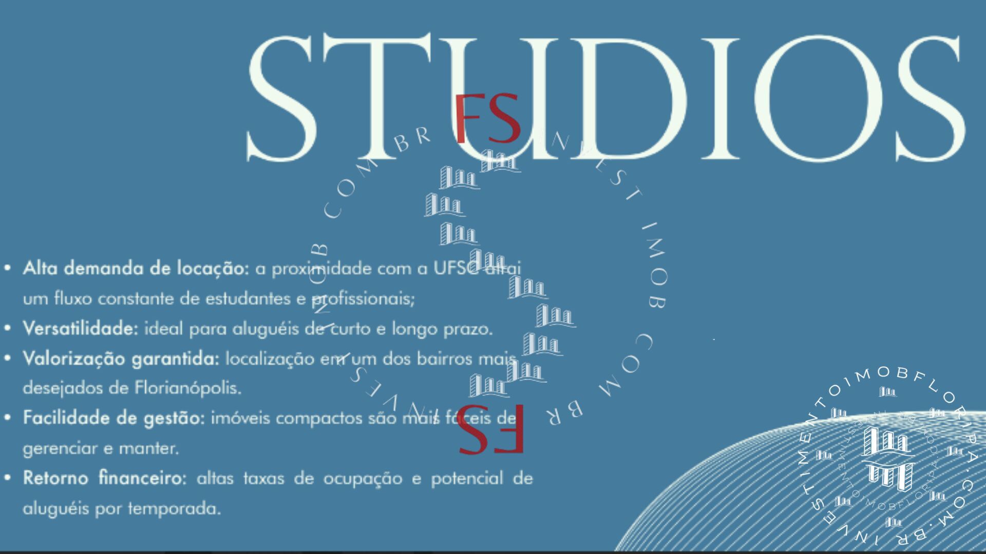 Florianópolis oferece uma uma infraestrutura variada, sempre em desenvolvimento, possui uma ampla variedade de opções de imóveis para compra ou aluguel, desde casas à beira-mar até apartamentos modernos, no centro da cidade ou nos recantos da Ilha, que por vezes se pode contemplar vistas de tirar o fôlego, para se comtemplar a natureza e a vida como um todo.