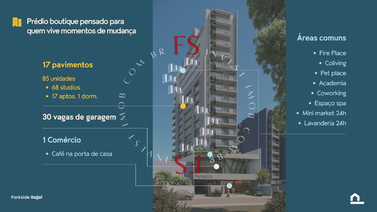 O Parkside Itajaí é um empreendimento moderno, com áreas comuns que oferecem muito conforto e integração entre as pessoas, como fire place, coliving, pet place, academia, coworking, espaço SPA, mini market, lavanderia e muito mais.